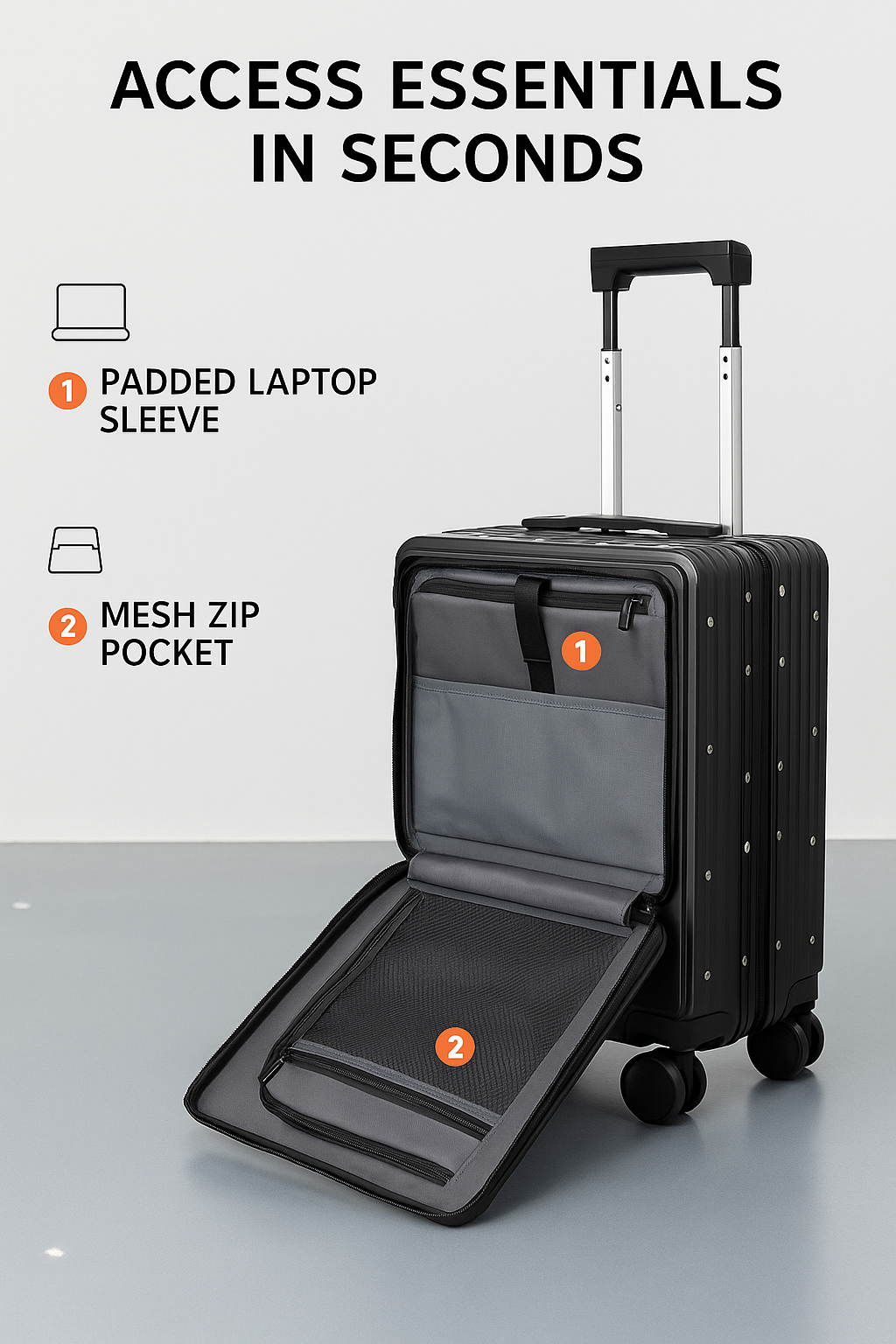 Access your essentials without opening the entire case. The dedicated front lid compartment stores your 15.6" laptop, tablet, or travel documents — perfect for fast airport checks or business stops. Padded, secure, and instantly reachable, it keeps your most-used gear right at hand.